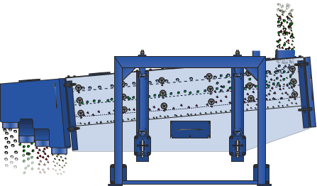 設(shè)備的篩箱在慣性力的作用下作前后往復(fù)運(yùn)動(dòng),并帶動(dòng)篩面做周期性搖動(dòng),迫使篩面上的物料隨篩箱一同做定向跳躍式運(yùn)動(dòng),小于篩面孔徑的物料通過(guò)篩框落到下層,稱為篩下物,大于篩面孔徑的物料經(jīng)連續(xù)翻滾跳躍運(yùn)動(dòng)后從排料口排出,完成篩分作業(yè)。