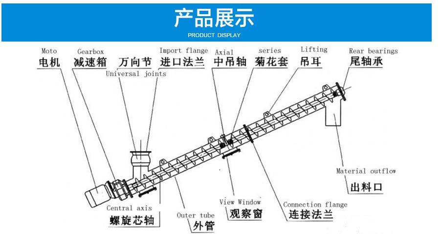 LS型螺旋輸送機結(jié)構(gòu)特征,一臺螺旋輸送機通常由本體、進(jìn)出裝置、驅(qū)動裝置三大部分組成。本體由首節(jié)、中間節(jié)、尾節(jié)三種組成。在首節(jié)內(nèi)裝有支推軸承承受軸向力,在中間節(jié)和尾節(jié)內(nèi)裝有用軸承支承螺旋軸,此外,在尾節(jié)內(nèi)還裝有可軸向移動的徑向軸承以補償螺旋軸長度的誤差和適應(yīng)溫度的變化。各螺旋軸之間采用法蘭式聯(lián)接,提高聯(lián)接軸的互換性,便于維修。