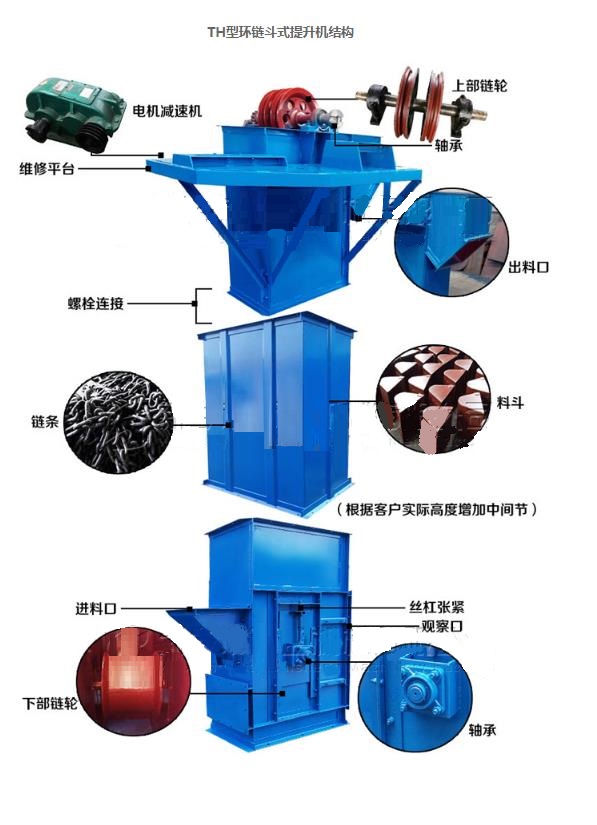 TH系列圓環(huán)鏈斗式提升機(jī)適用于輸送粉狀、粒狀及小塊狀的無(wú)磨琢及磨琢性小的物料。TH型環(huán)鏈?zhǔn)蕉肥教嵘龣C(jī)是一種圓環(huán)鏈斗式提升機(jī)采用混合式或重力卸料,挖取式裝料。TH型環(huán)鏈?zhǔn)蕉肥教嵘龣C(jī)適用于輸送堆積密度小于1.5t/m3易于掏取的粉狀、粒狀、小塊狀的底磨琢性物料。如煤、水泥、碎石、砂子、化肥、糧食等。TH型斗式提升機(jī)用于各種散狀物料的垂直輸送。適用于輸送粉狀、粒狀、小塊狀物料,物料溫度在250℃以下。