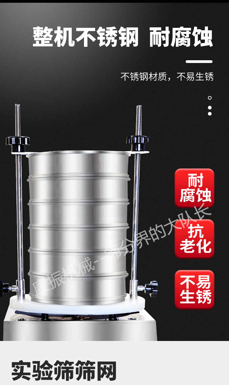 標(biāo)準(zhǔn)檢驗篩(試驗篩)又叫標(biāo)準(zhǔn)篩,是具有標(biāo)準(zhǔn)篩孔的篩析工具,又是檢驗其他粒度檢測方法的工具或依據(jù),實驗室篩分所用的篩子是按表中有關(guān)標(biāo)準(zhǔn)制成的篩孔大小不一的試驗套篩,即標(biāo)準(zhǔn)篩。標(biāo)準(zhǔn)篩是由直徑15~450mm,高為25~50mm的篩框和篩網(wǎng)組成。篩框不銹鋼板制成,實驗室篩分用套篩是一個篩子套在另一個篩子上疊成的。上層的篩孔大,下層的篩孔小。上部加一個蓋,下部加一個底盤,以減少灰塵和損失。底盤還用來承接通過后一個篩子的細粒級產(chǎn)品。