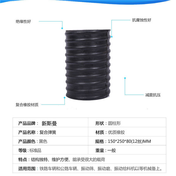 復合彈簧:是由金屬螺旋彈簧和橡膠復合在一起的園筒狀彈性體。該產(chǎn)品優(yōu)于金屬彈簧,具有抗腐蝕性好、壽命長等優(yōu)點,與其它彈簧相比,減振能力強,緩沖效果好。