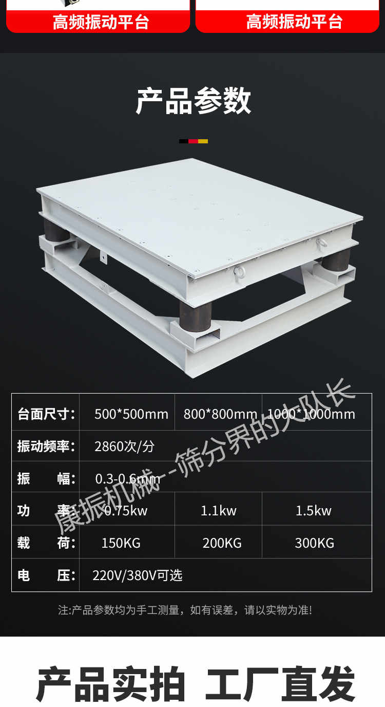 ◆大功率、大臺(tái)面;功率可大7.5kw,激振力80KN,可承載10T。