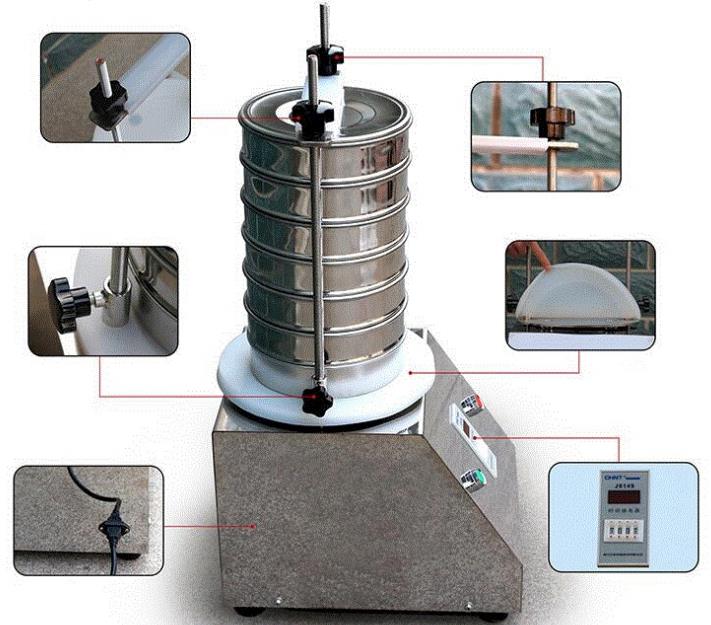 再通過振動盤傳導(dǎo)至安放在振動盤上部篩框上,然后由需要檢測目數(shù)的篩框把小于篩網(wǎng)孔徑的物料顆粒篩分至下層篩框,如此層層篩選,