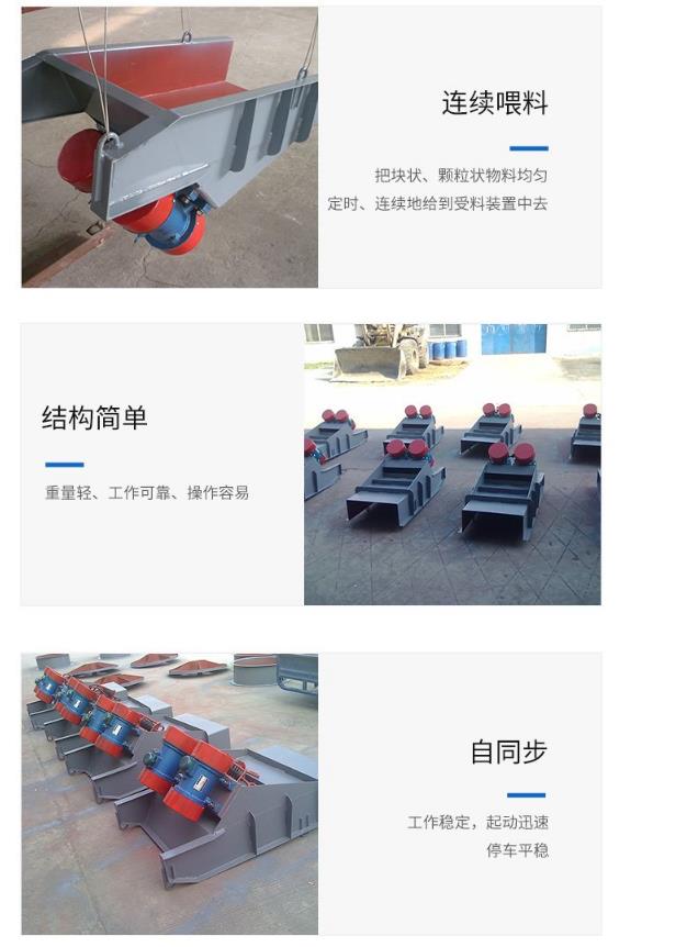 3、該機(jī)結(jié)構(gòu)簡單,振動(dòng)平穩(wěn),喂料均勻,連續(xù)性能好,激振力可調(diào);隨時(shí)改變和控制流量,操作方便;偏心塊為激振源,噪音低,耗電少,調(diào)節(jié)性能好,無沖料現(xiàn)象;若采用封閉式機(jī)身可防止粉塵污染。
