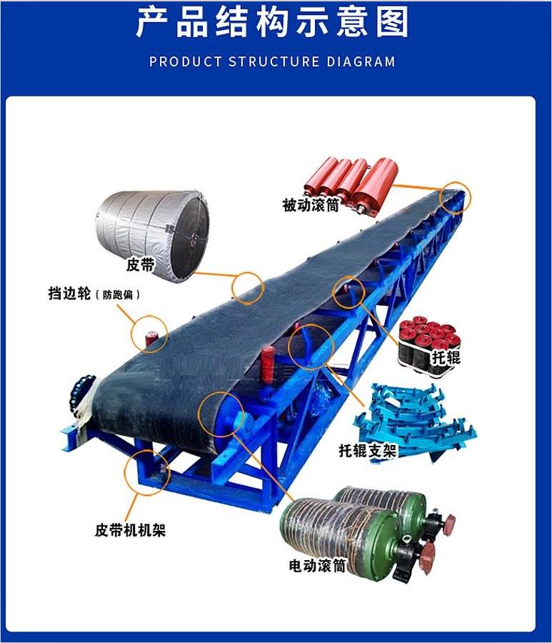 物料及袋裝物料,如煤、碎石、砂、水泥、化肥、糧食等。被送物料溫度小于60℃。其機(jī)長(zhǎng)及裝配形式可根據(jù)用戶要求確定,傳動(dòng)可用電滾筒,也可用帶驅(qū)動(dòng)架的驅(qū)動(dòng)裝置。