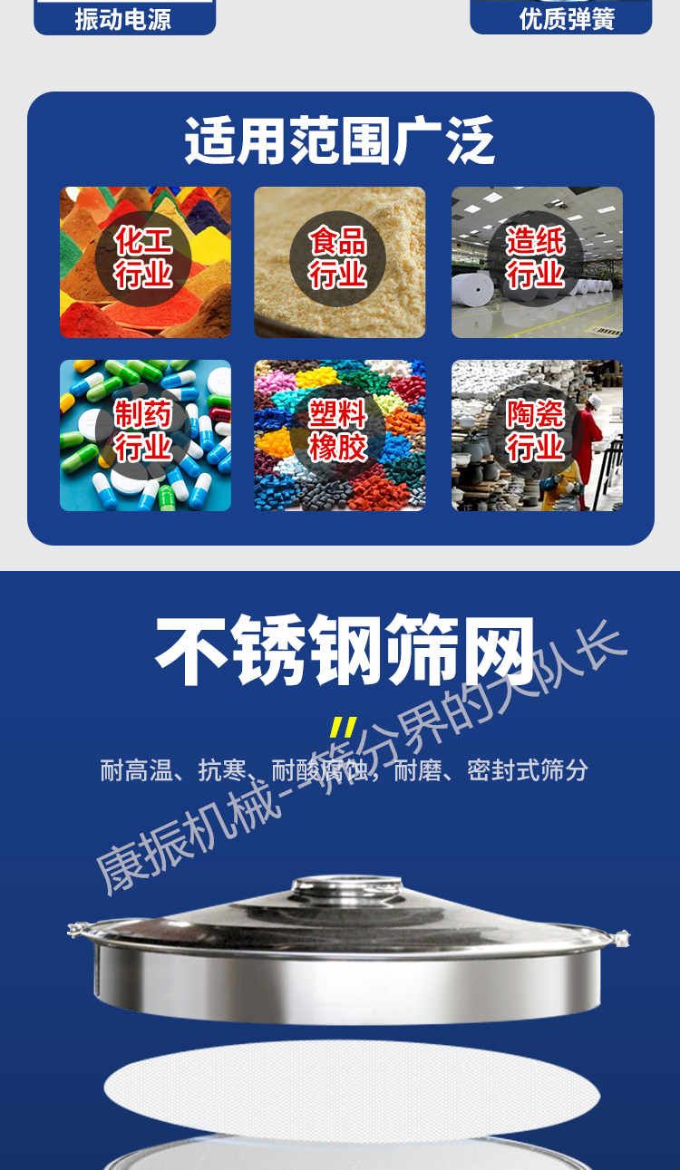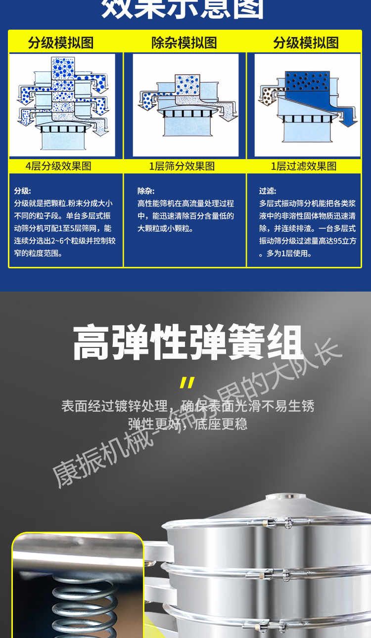 篩選范圍廣--只有系列三次元旋振篩能分選如此廣的原料范圍:任何顆粒、細(xì)粉、漿液都可以篩選。篩分細(xì)500目(28微米),過濾細(xì)5微米。網(wǎng)孔防堵塞--三次元振動(dòng)功能及自動(dòng)清理堵網(wǎng)裝置把堵網(wǎng)幾率降到小。 單層或多層分選--每臺(tái)旋振篩可選一至五層篩網(wǎng),能同時(shí)進(jìn)行二到六個(gè)等級(jí)的分選或過濾。